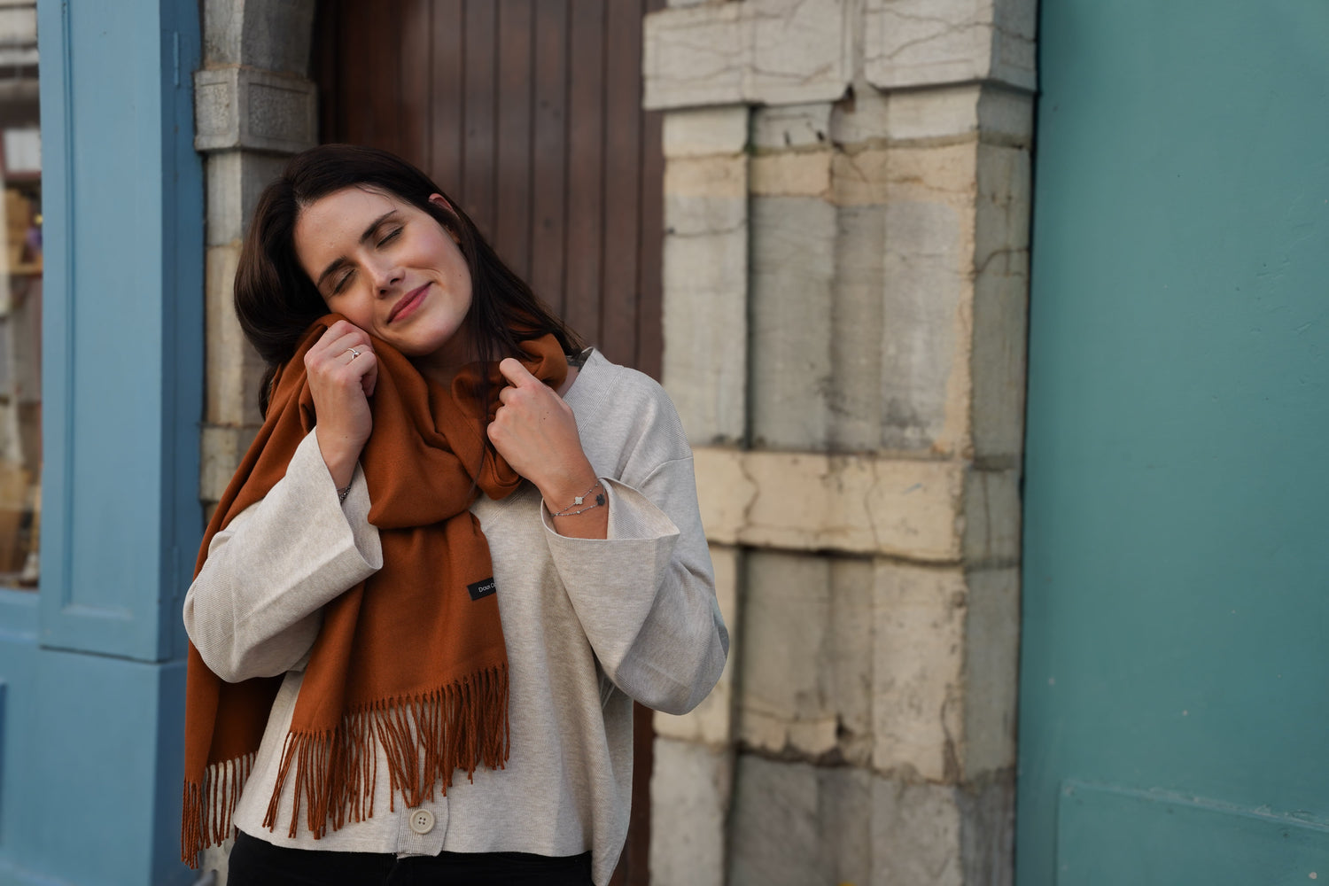 L’écharpe cachemire cuivre est idéale à porter toute l'année
