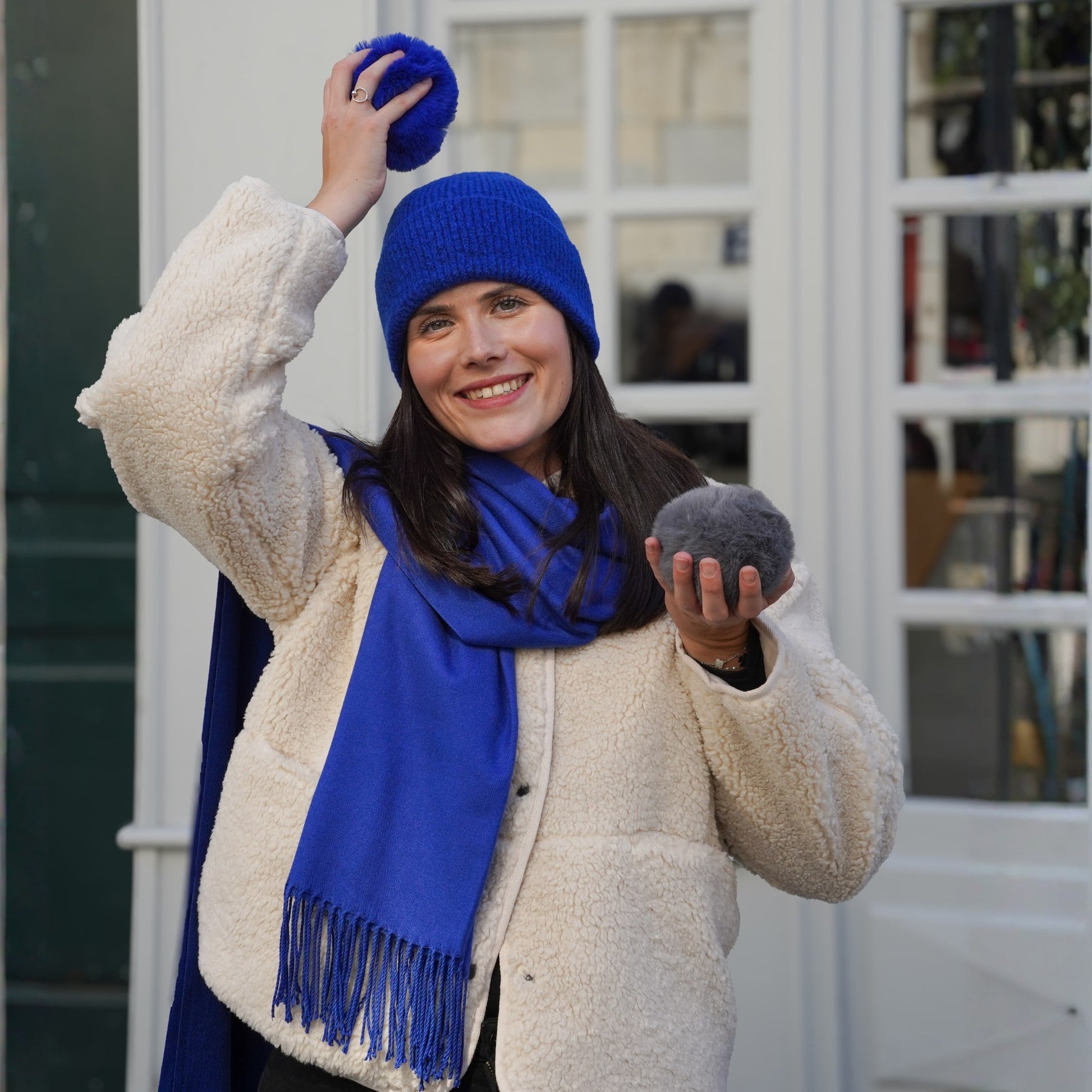 • 1 bonnet en cachemire avec 2 pompons amovibles,